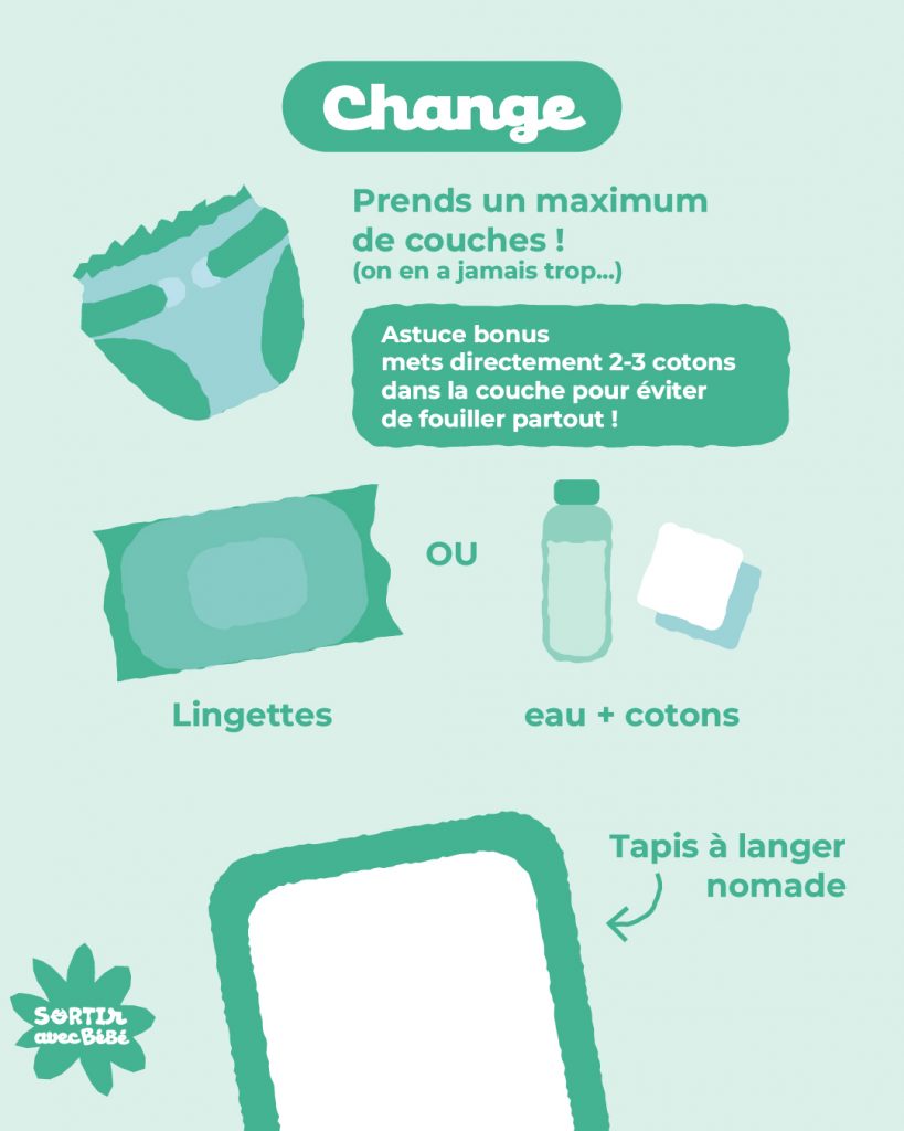 • Pour un bébé nourri au biberon : prévoyez un ou plusieurs biberons, la dose de lait en poudre dans une boîte doseuse, et de l’eau déjà dans le biberon pour gagner du temps.