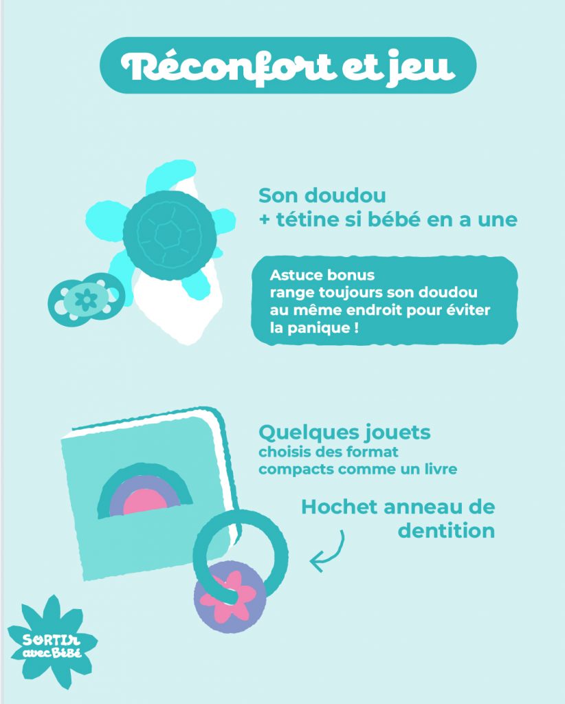 • Quelques jouets légers et faciles à transporter (livre en tissu, hochet, anneau de dentition)